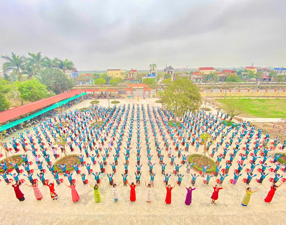 Ban giám hiệu, các thầy cô giáo cùng toàn thể các em học sinh tham gia màn đồng diễn bài “ Mẹ yêu ơi” thật nhiều cung bậc cảm xúc.