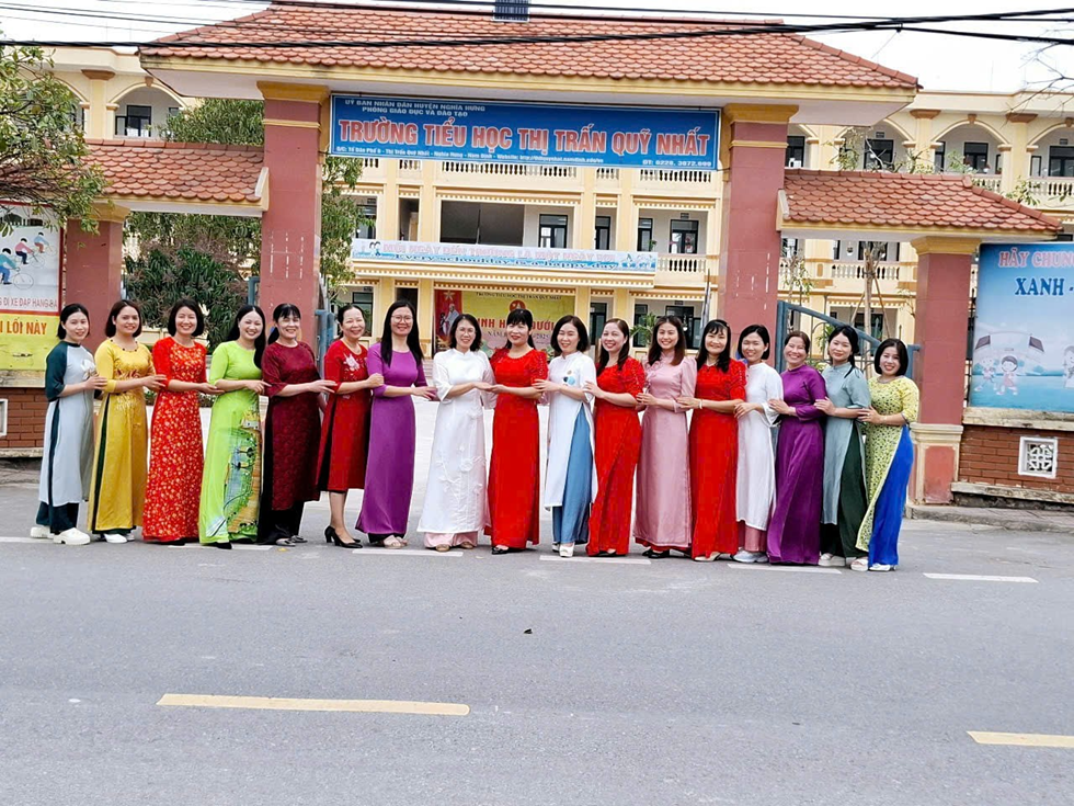 Các cô giáo trường Tiểu học thị trấn Quỹ Nhất thướt tha, duyên dáng trong tà áo dài, tôn vinh nét đẹp đằm thắm của người phụ nữ Việt.