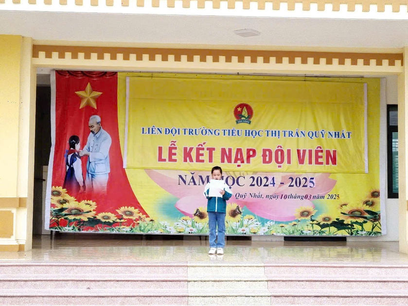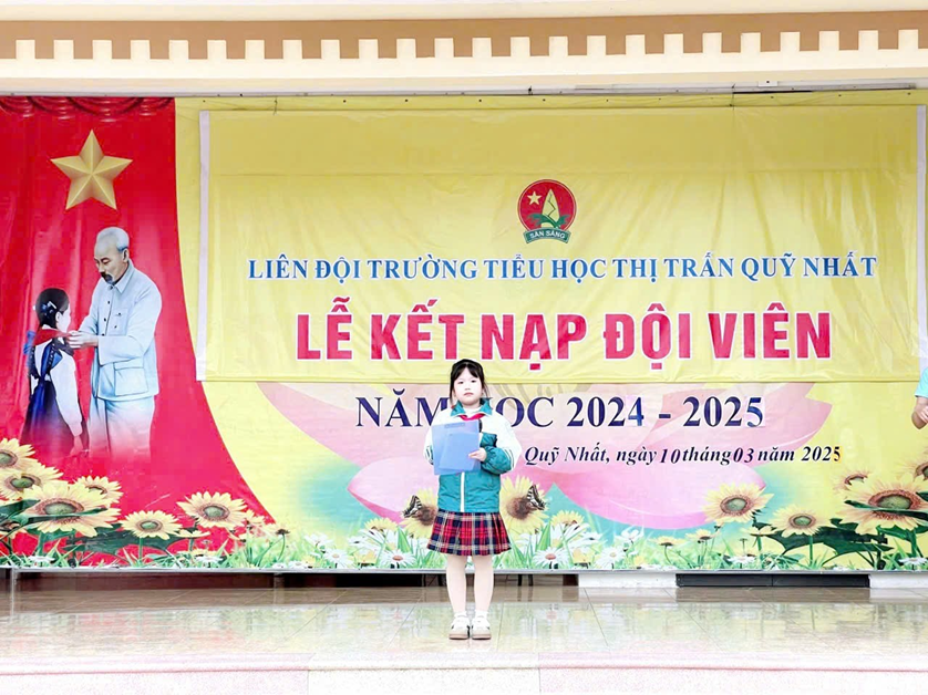 Tiếp theo chương trình chị Trần Thị Hoà Bình – Phó Chủ tịch Hội đồng Đội thị trấn Quỹ Nhất đọc Quyết định chuẩn y kết nạp Đội viên Đội TNTP Hồ Chí Minh và căn dặn Đội viên mới “Kể từ ngày hôm nay, các em đã chính thức được đứng trong hàng ngũ Đội TNTP HCM, hy vọng rằng các em sẽ luôn luôn cố gắng học tập, rèn luyện nhiều hơn nữa để trở thành Đội viên tốt”.
