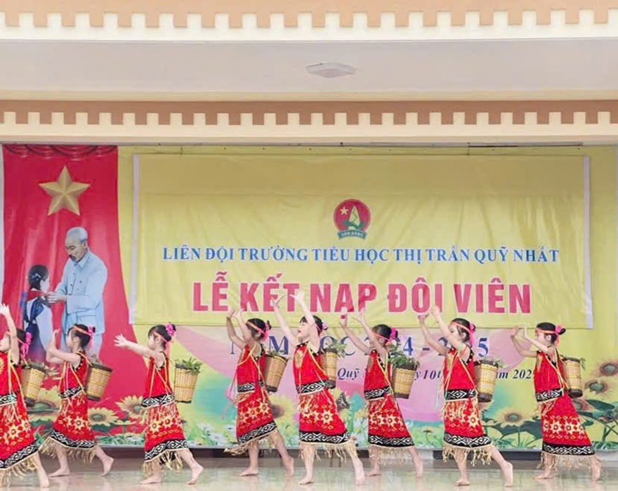 Mở đầu buổi lễ kết nạp Đội là chương trình văn nghệ chào mừng rất sôi nổi và hấp dẫn của các em học sinh trường Tiểu học thị trấn Quỹ Nhất.