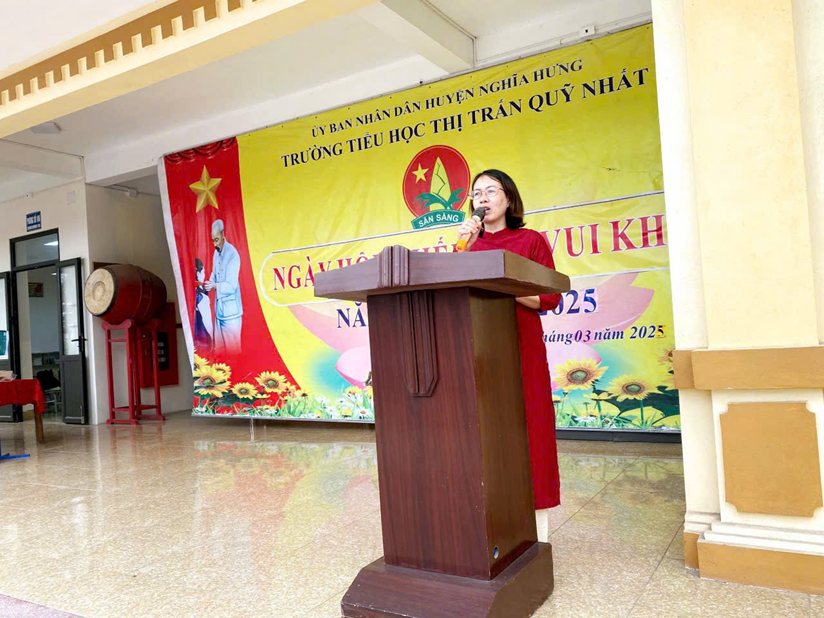 Sau nghi lễ chào cờ, cô Nguyễn Thị Mến – Bí thư Chi bộ, Hiệu trưởng nhà trường, đã phát biểu khai mạc. Cô chia sẻ: “Toàn dân rèn luyện thân thể theo gương Bác Hồ vĩ đại” tích cực tập luyện thể thao để nâng cao sức khỏe, rèn luyện thể chất, góp phần phát triển giáo dục toàn diện cho học sinh đồng thời nhấn mạnh vai trò quan trọng của Ngày hội trong việc giáo dục và rèn luyện thế hệ trẻ, động viên và khích lệ các em nhiệt tình tham gia các hoạt động bổ ích của Ngày hội.